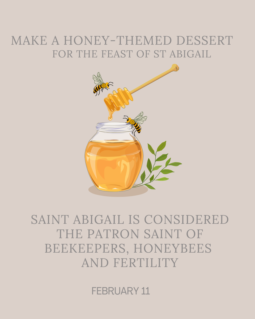Watch this episode on Patristic Nectar Family Youtube about St Abigail and the miracle of the bees. A simple and fun way to celebrate her feast is to make a honey dish, or whipped honey (just one ingredient)!