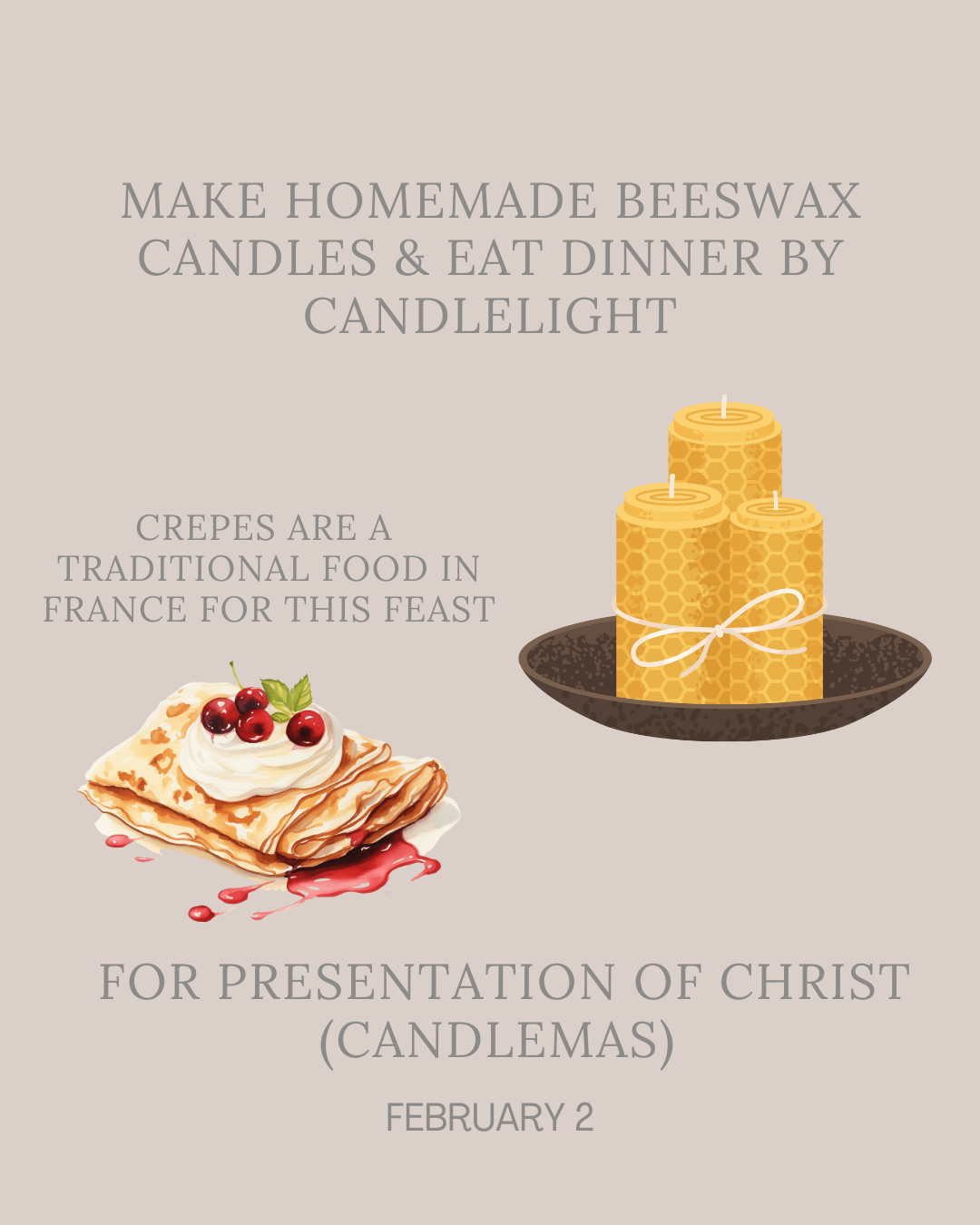 Make your Own Candles! About 450 AD in Jerusalem, people began the custom of holding lighted candles during the Divine Liturgy of this feast day. Making candles is a fun way to connect with this long standing tradition and have fun while doing it! You can make candles using a rolled beeswax kit like this one (affiliate link) or by melting pellets of beeswax - see THIS tutorial.