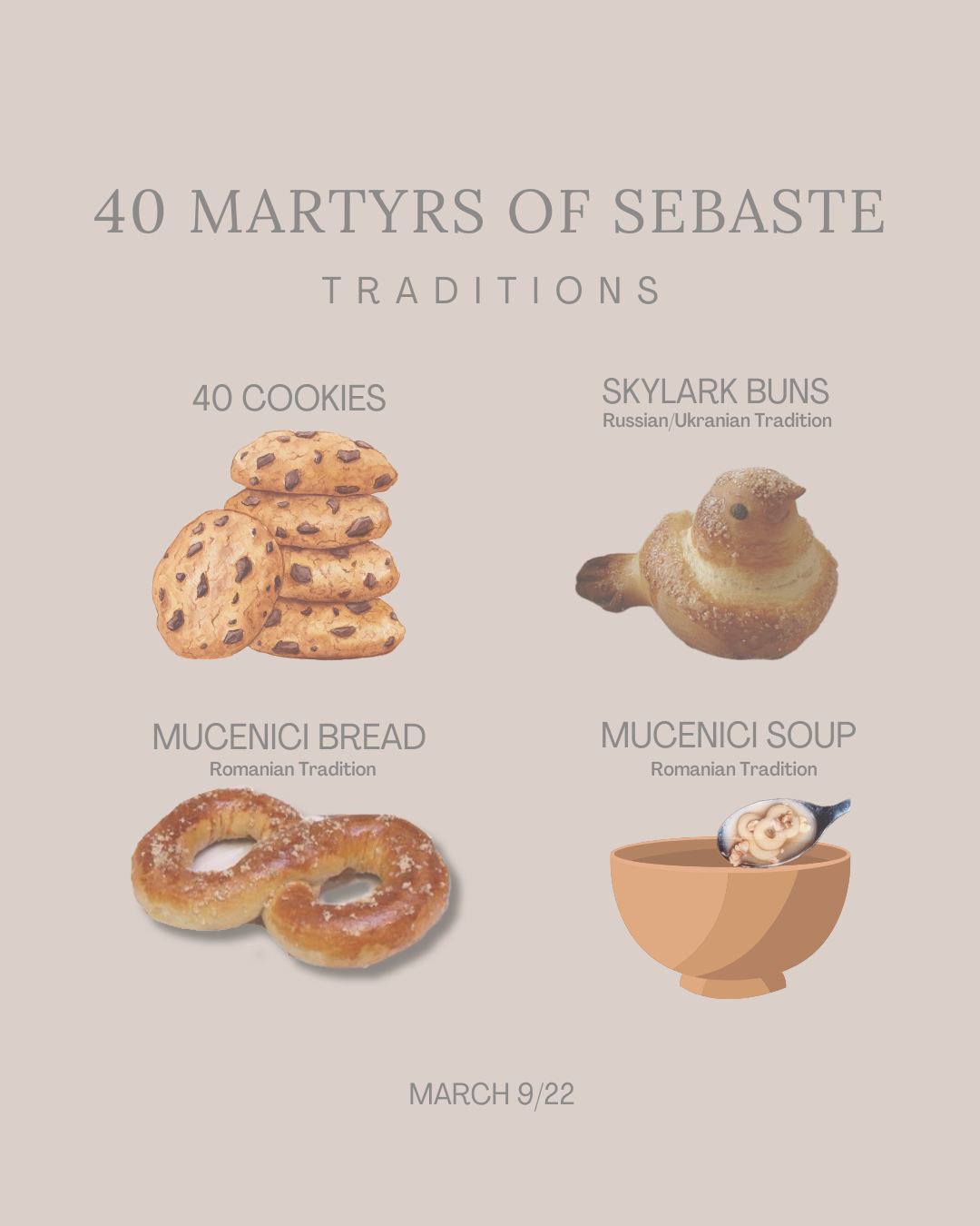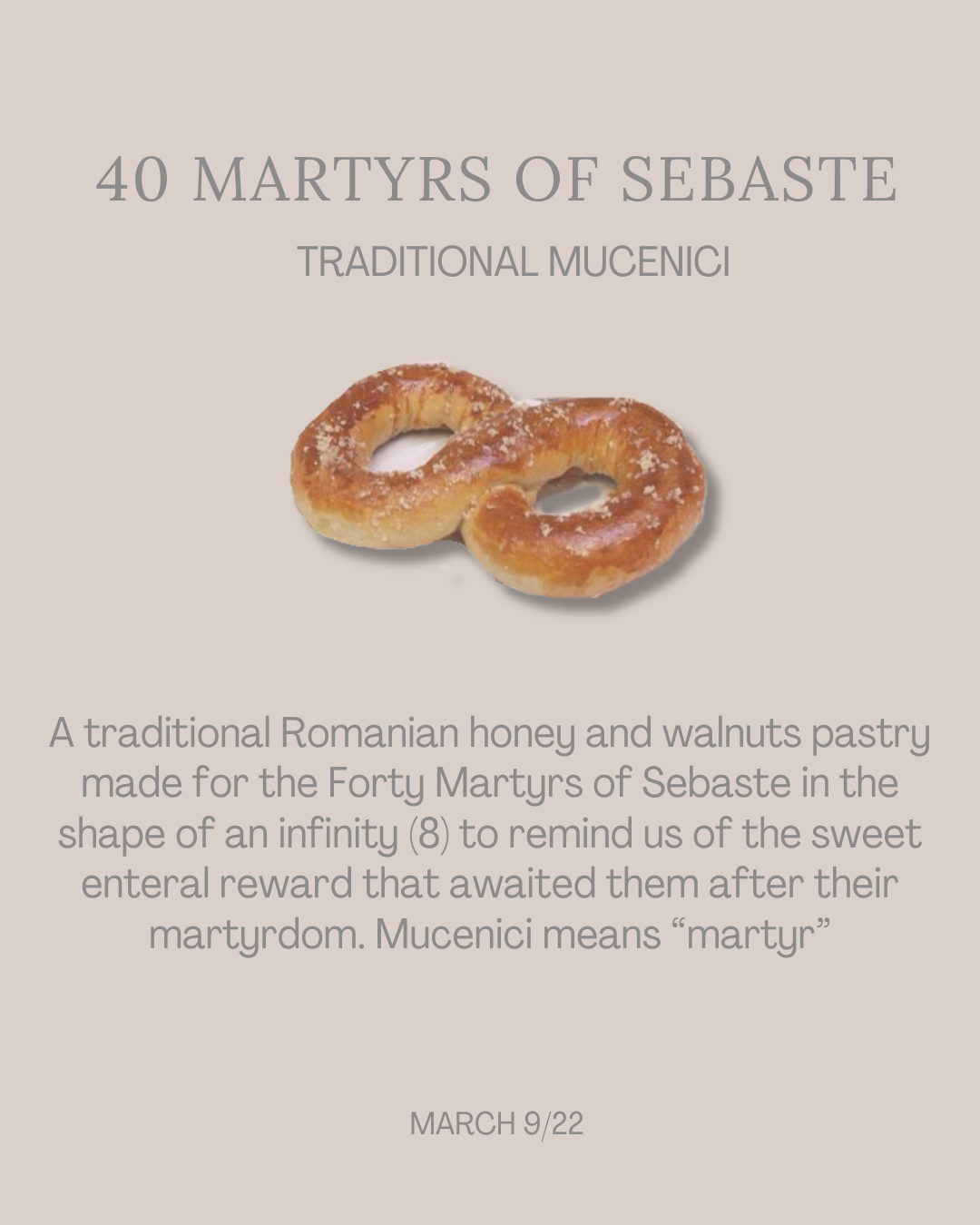 Fun Fact: The date of this feast may have been intentionally chosen around/during Great Lent. The reasons; (1) the number 40 being both the number of martyrs and the number of days in the Fast; (2) the martyrs’ endurance serves as an example to the faithful to persevere to the end (whether that be during Great Lent or life in general) in order to attain their heavenly reward! Check out this recipe for a traditional mucenici.